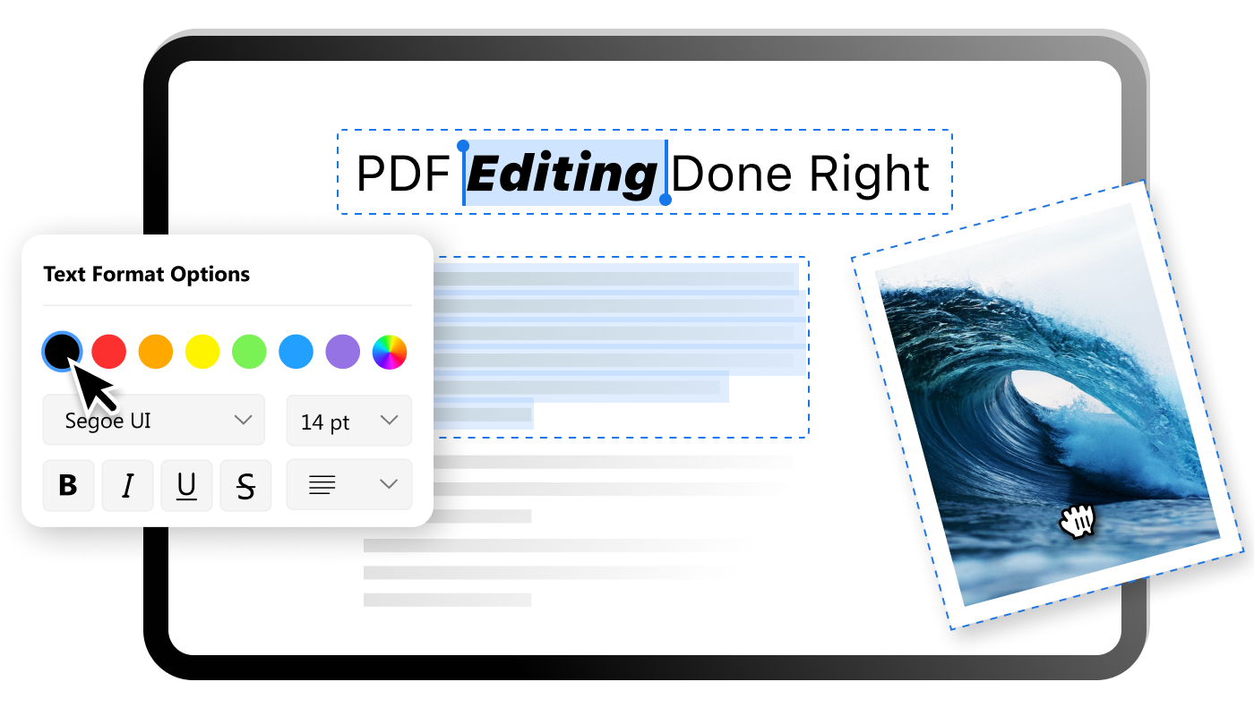 Other than text editing, extensive PDF editing features are also offered for you to create PDF files: resize/reposition inserted images, fill out PDF forms, insert signatures, add comments, remove/add watermarks, highlight text, etc.
