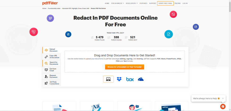 pdfFiller provides an online platform for redacting text or images in PDF files. You can easily upload and edit your PDFs, and it supports various file formats, including DOC, DOCX, RTF, PPT, PPTX, JPEG, PNG, or TXT. However, the upload file size is limited to 25MB. While the interface may seem a bit cluttered due to the accumulation of elements, pdfFiller offers a series of navigation tabs after file upload to guide you through its main functional areas. The tool automatically saves your operations, eliminating concerns about data loss.